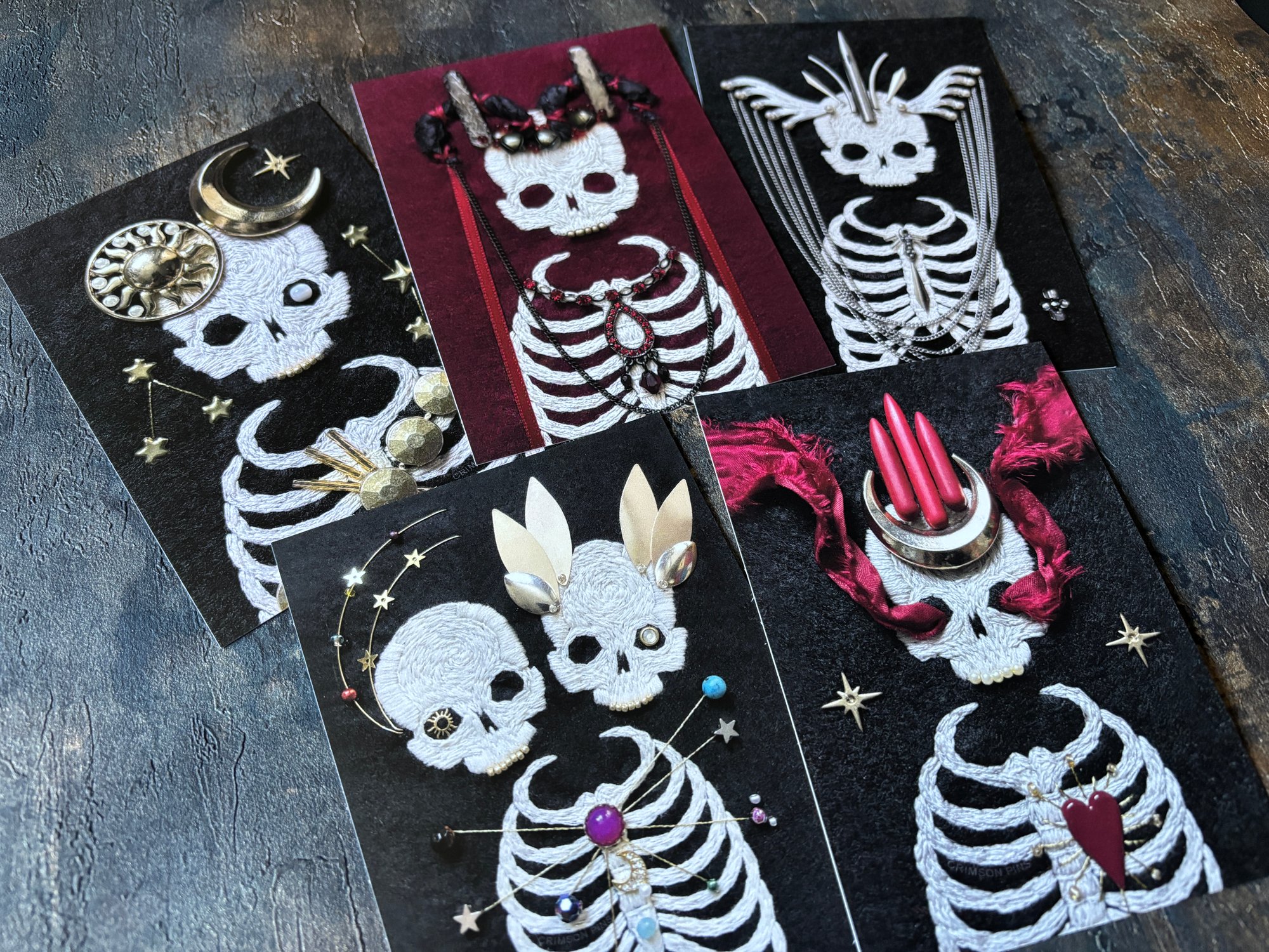 A set of five beautiful printed postcards, featuring photographs of five hand-embroidered skeletons from Crimson Pins' back catalogue. Send to a friend or frame and enjoy!