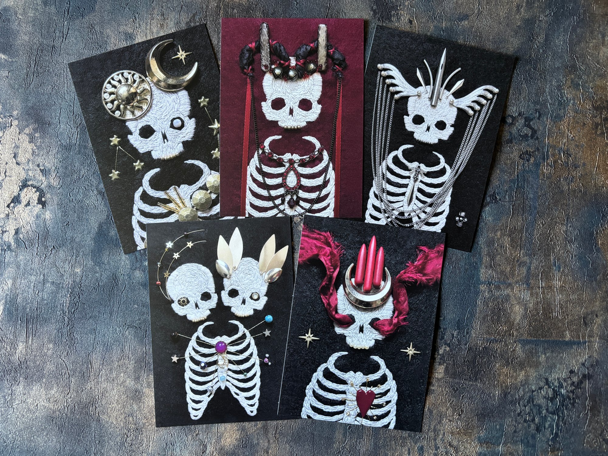 Set Ethereal - Set of 5 Postcards Prints of Skeleton Embroidery